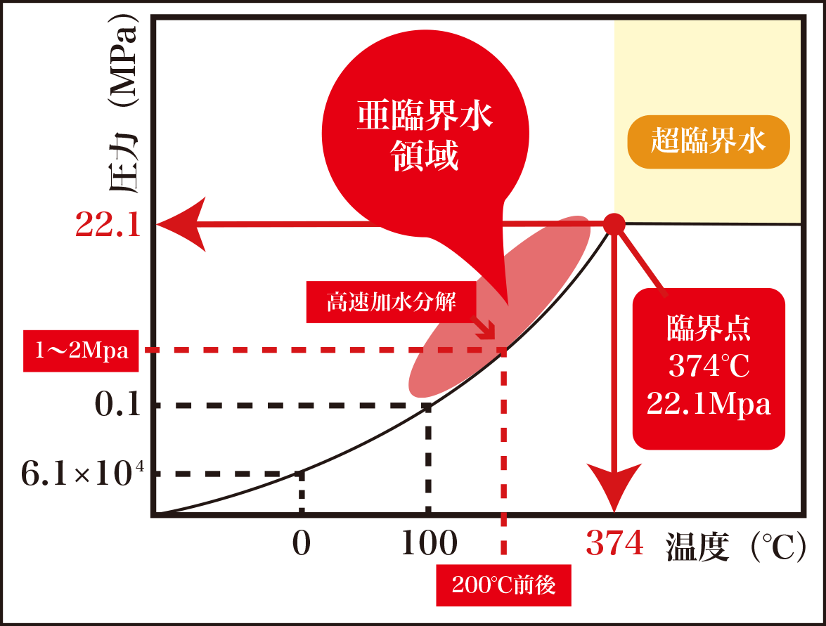 亜臨界水とは、水の臨界点(374℃・22.1MPa)より少し手前の高温・高圧状態にある水のことです。