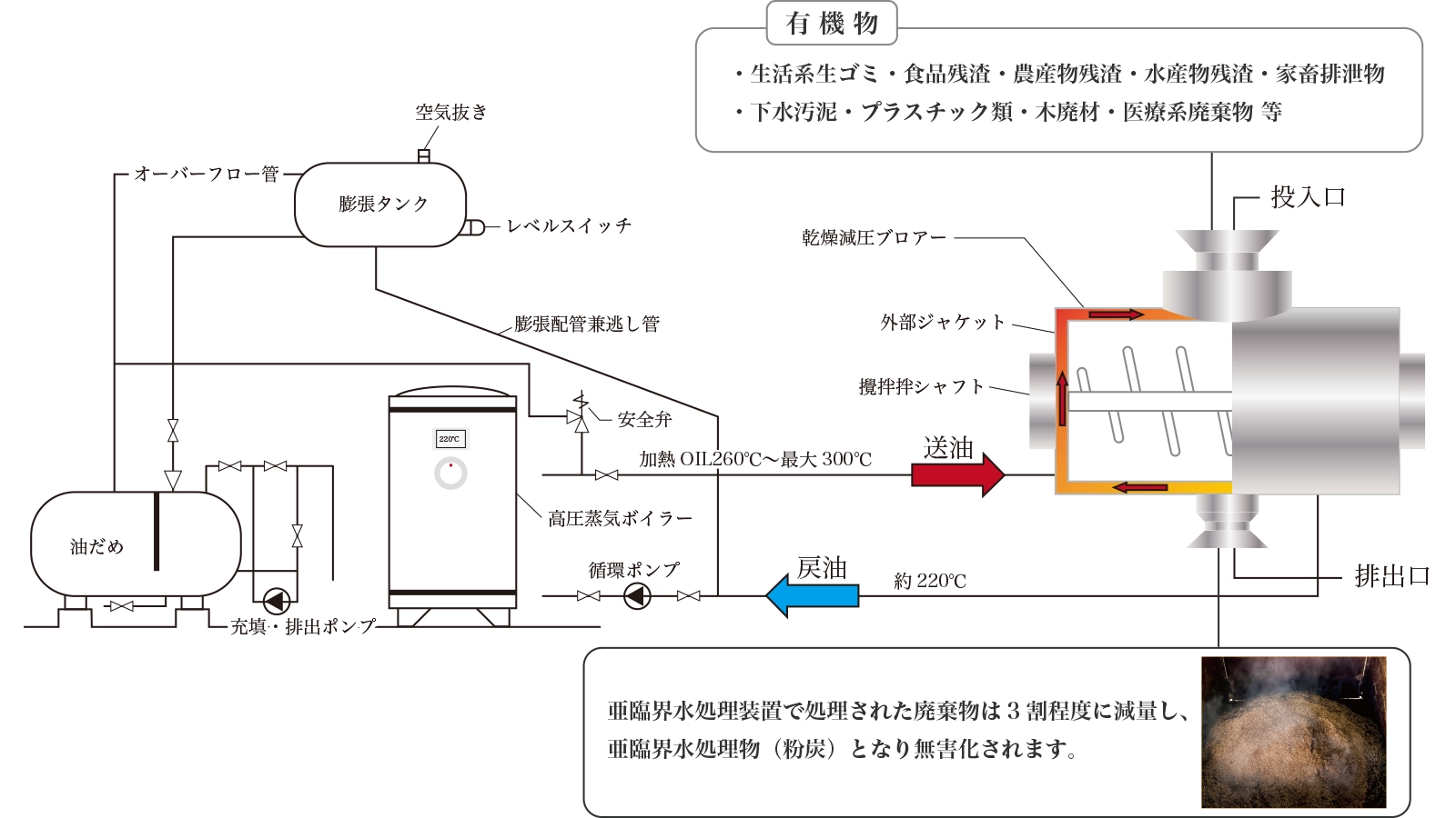 亜臨界水処理装置は、水を高温・高圧下で亜臨界状態にし、有機物を短時間で分解・液化する環境技術です。